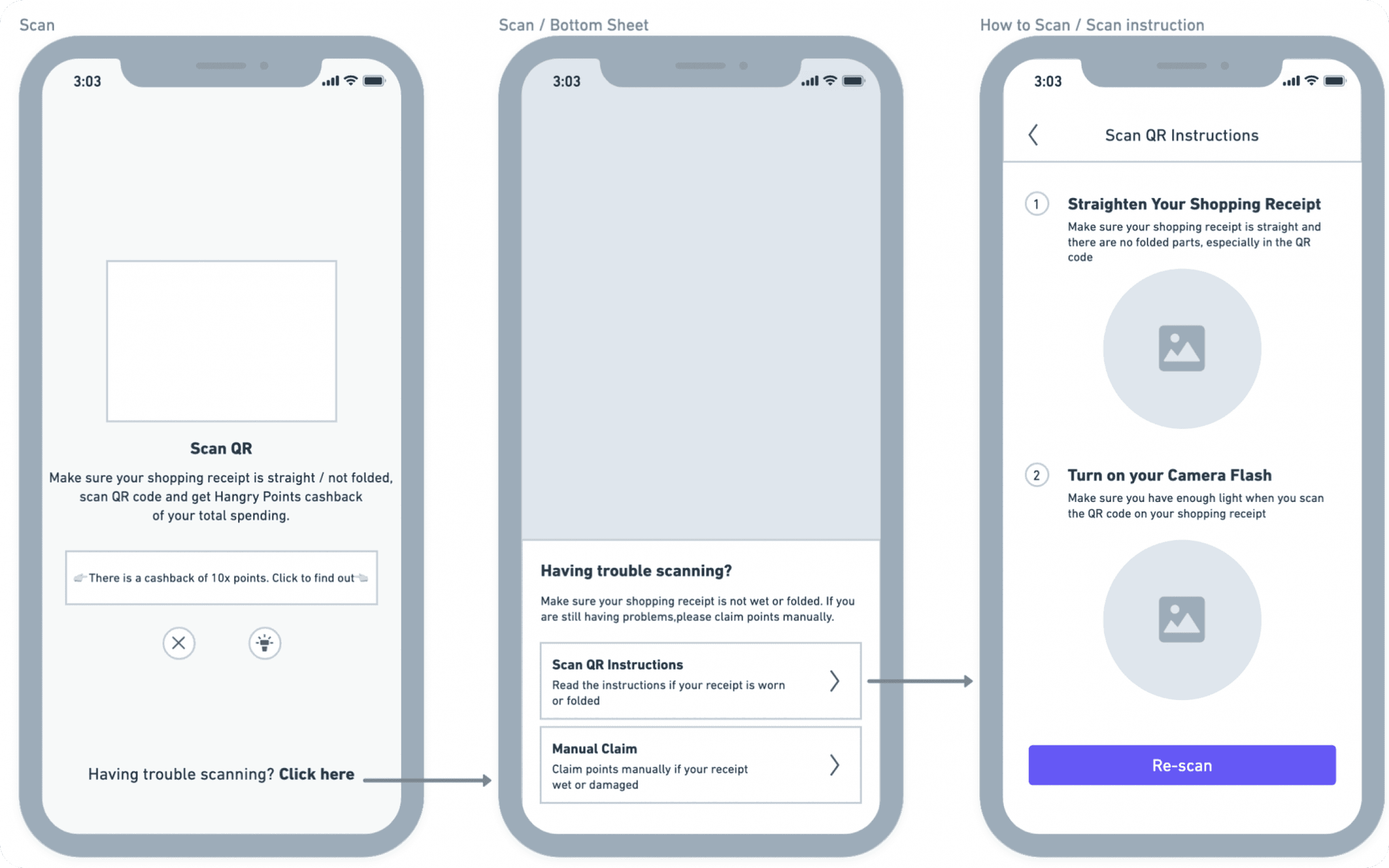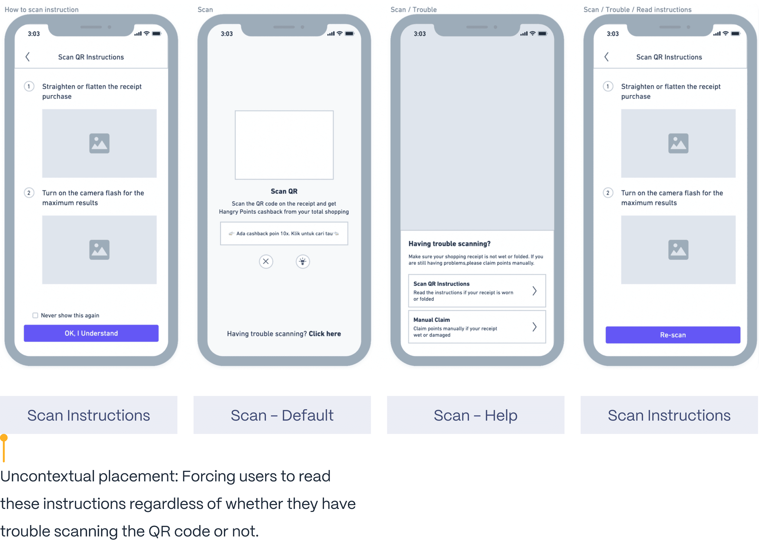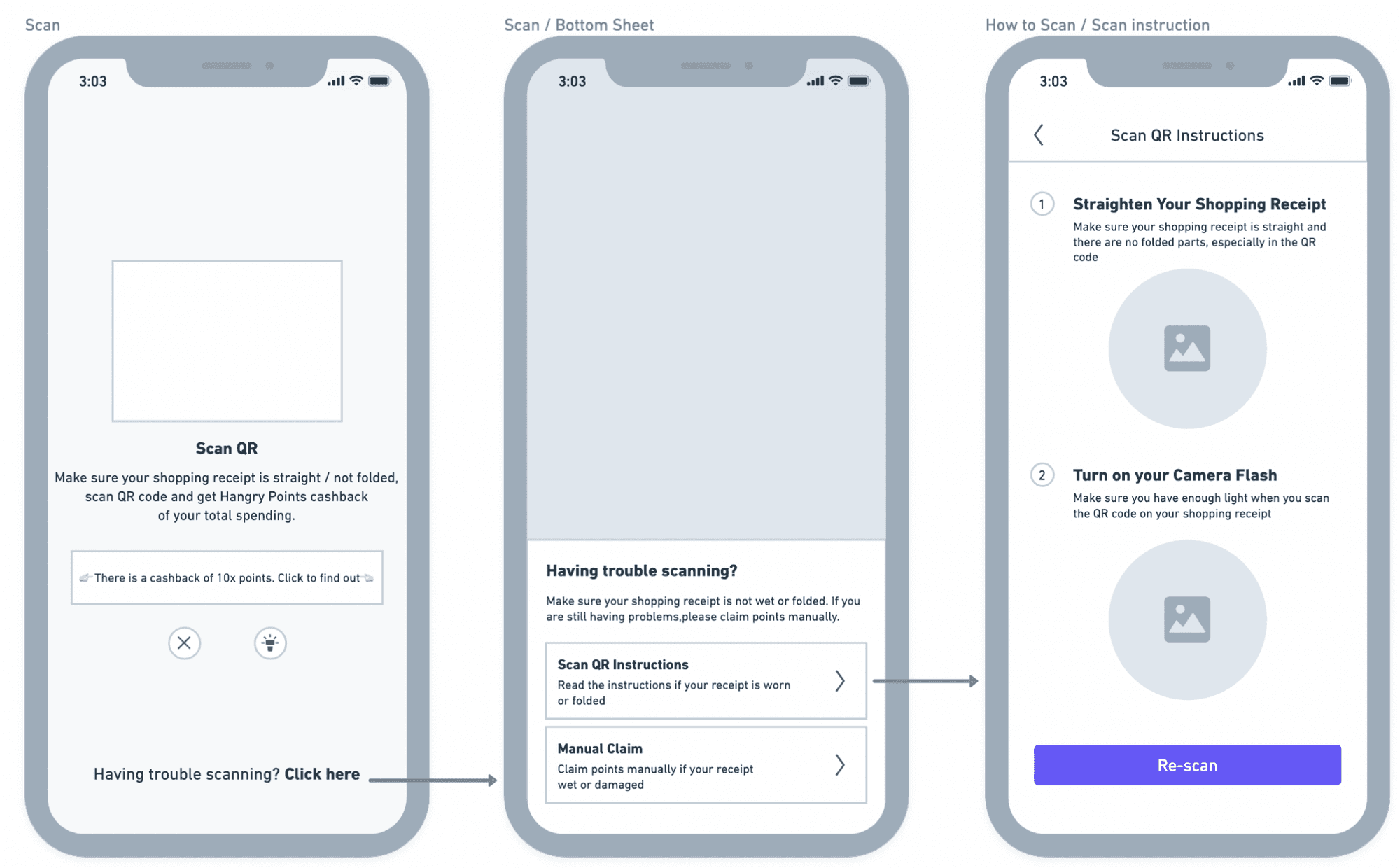 we will not force users to read instructions after clicking the 'Scan' button. Therefore, I have created a new wireframe. On the 'Scan QR Instructions' page, I will provide step-by-step instructions on how to properly scan the QR code. Additionally, I will include a call-to-action (CTA) for users to 're-scan' after reading all the instructions.