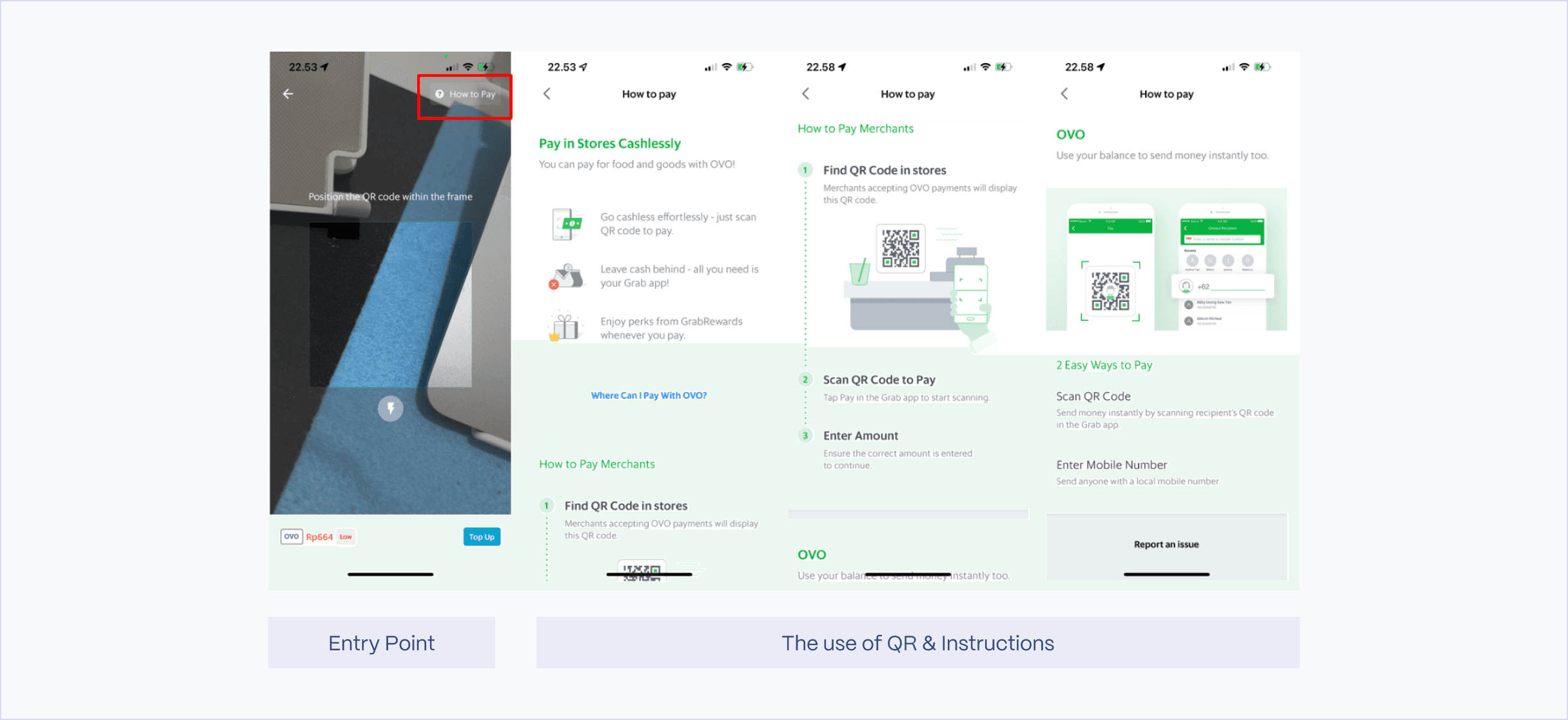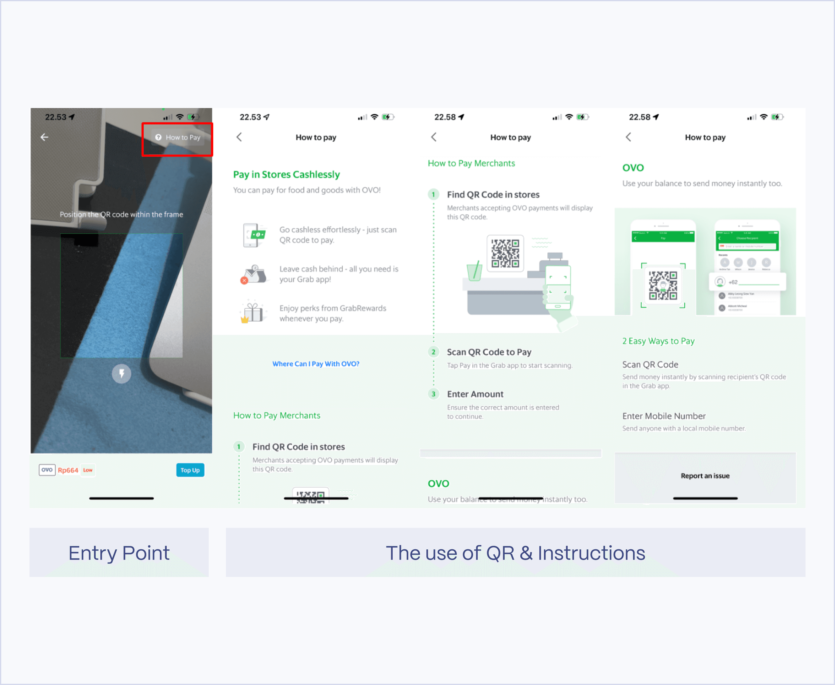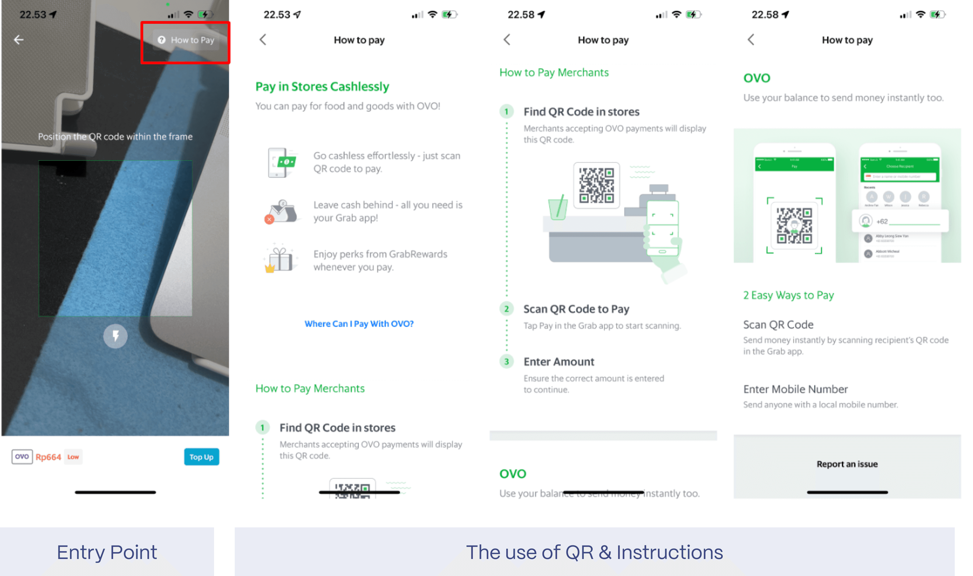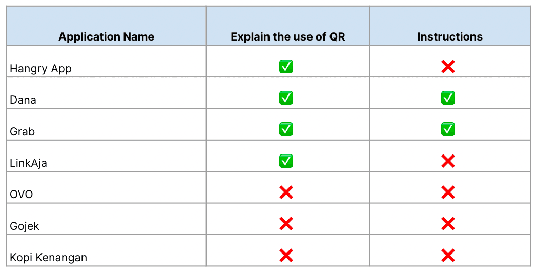 Both DANA and Grab explain how to use their scan QR code feature and also provide a 'Help?' section to guide users on how to use it properly.