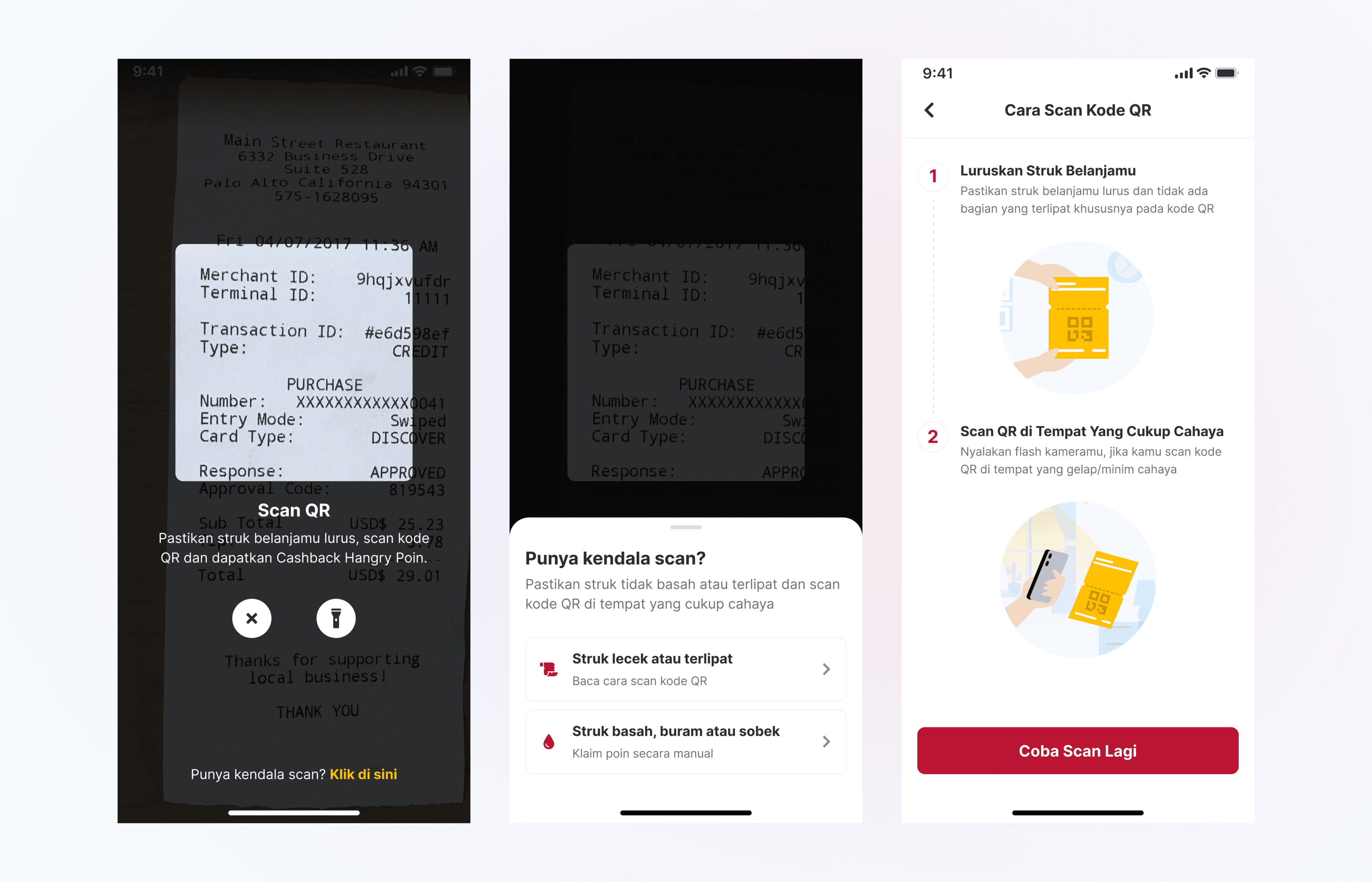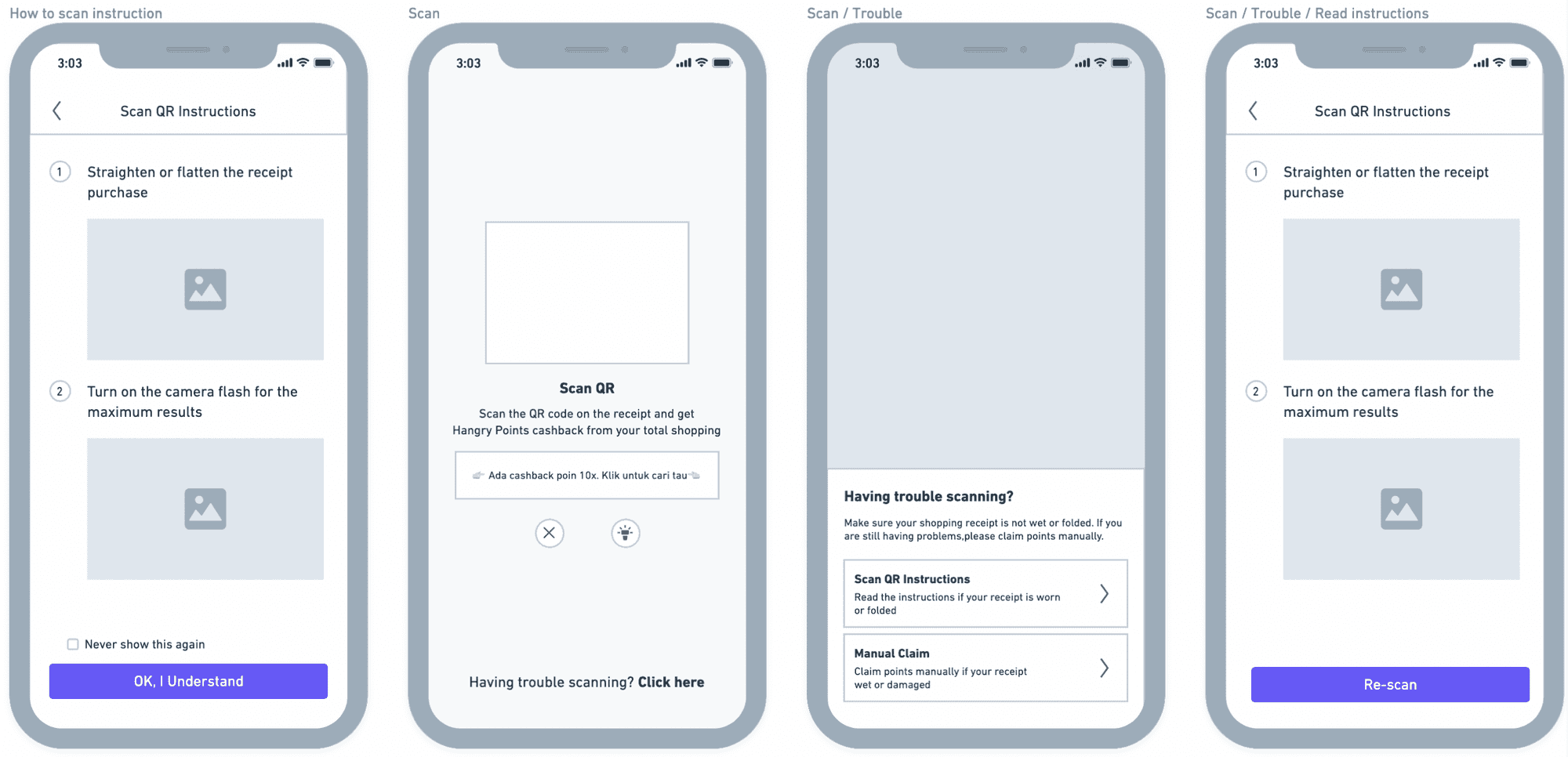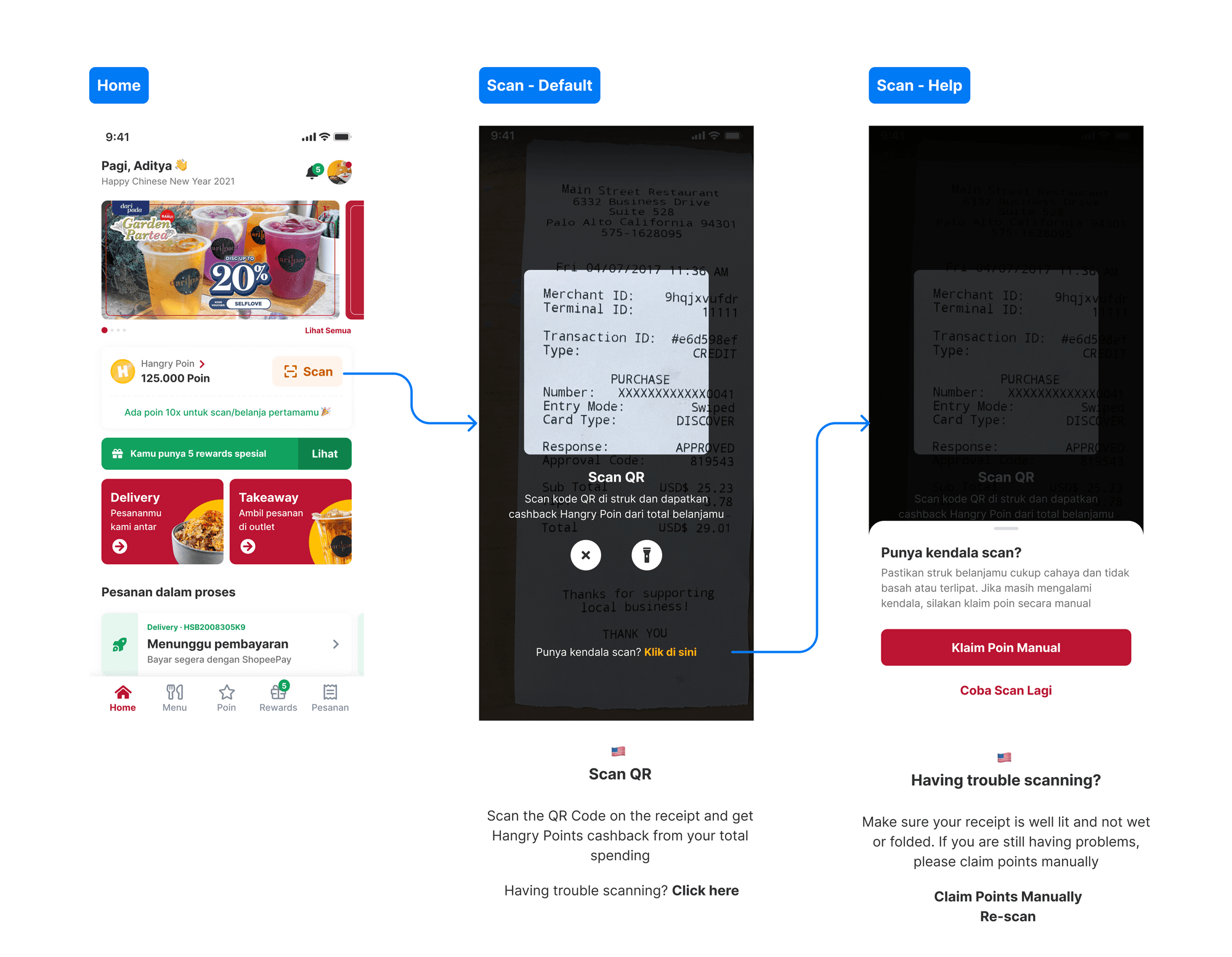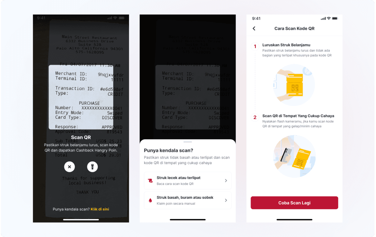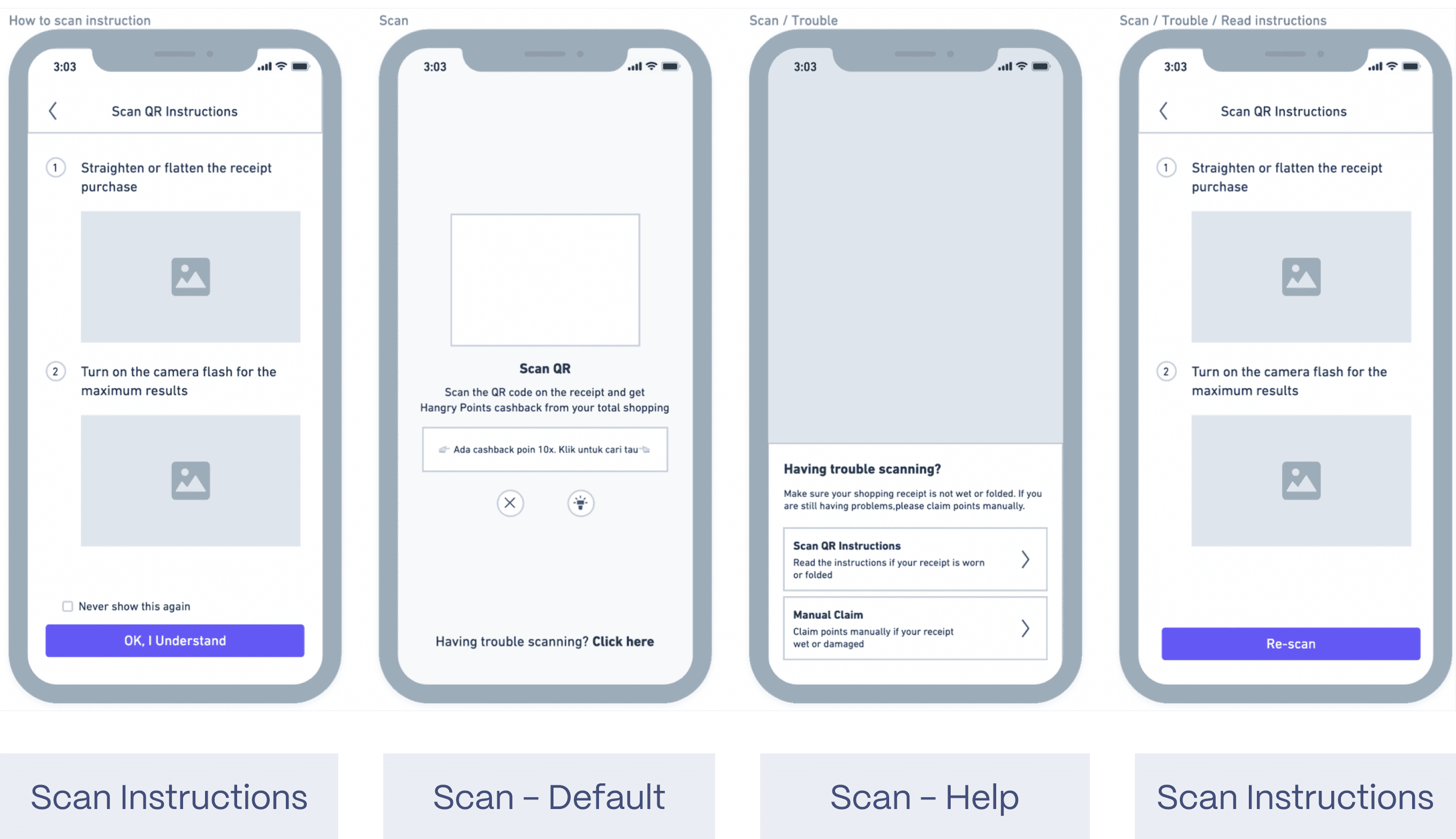 As shown in the design above, especially on the scan help page, the only available options are 'Claim Points Manually' and 'Try Again.' This lack of clear instructions for users encountering issues scanning their QR codes has led to numerous complaints.